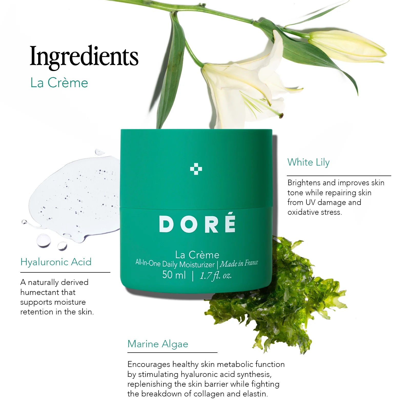 Encourages healthy skin metabolic function by stimulating hyaluronic acid synthesis, replenishing the skin barrier while fighting the breakdown of collagen and elastin.